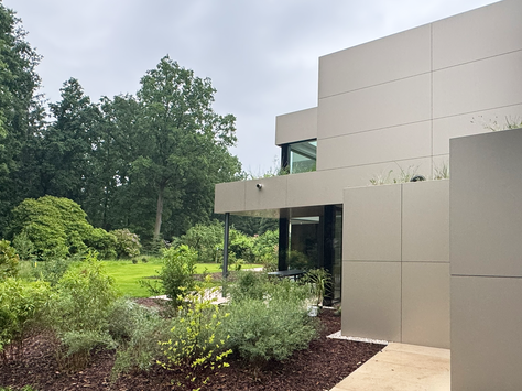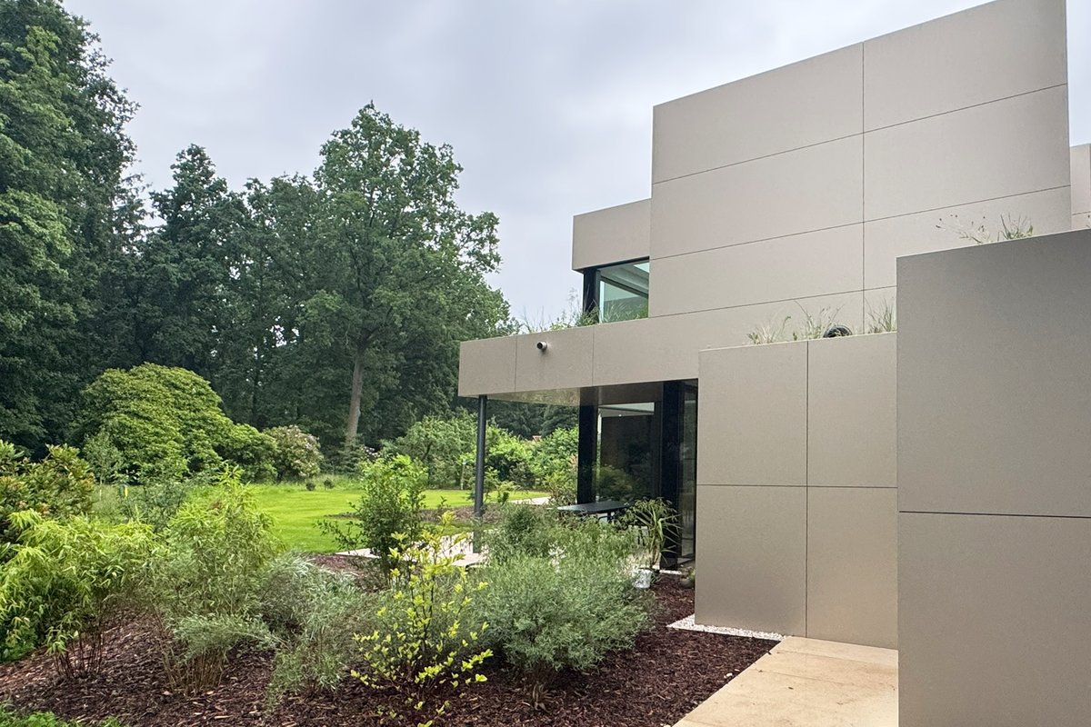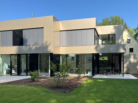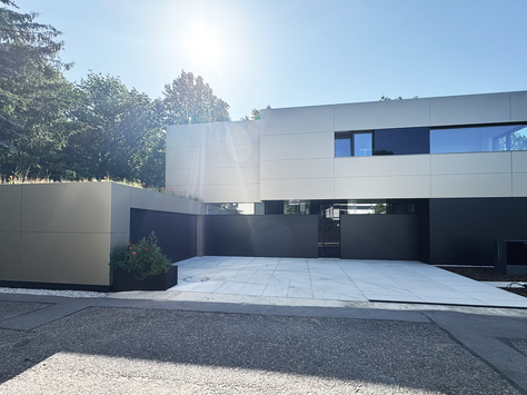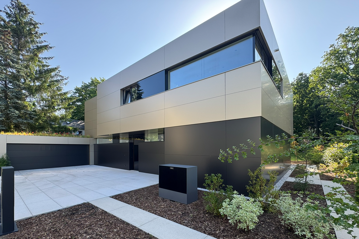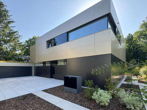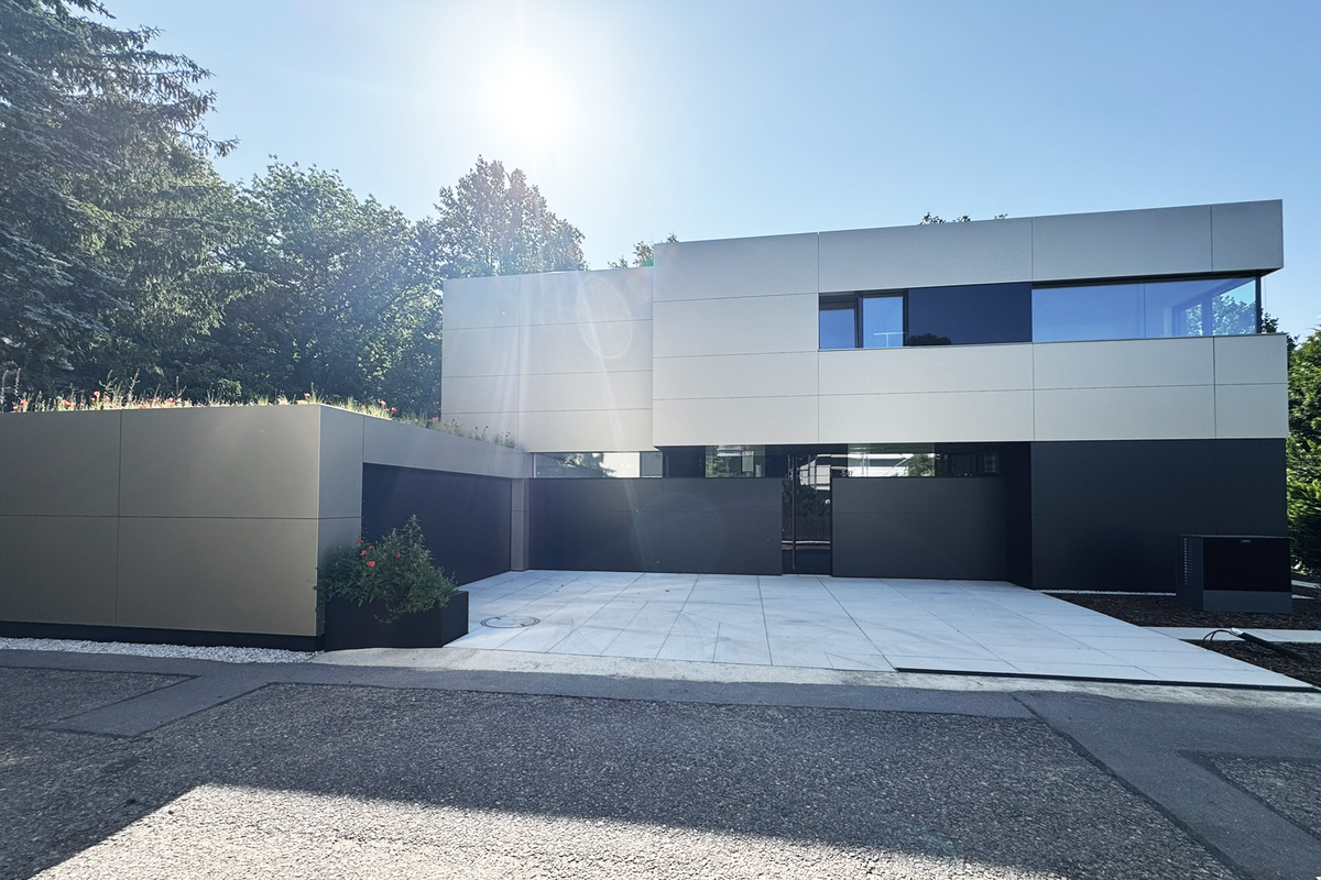 Die Fassade des Koschmiederhauses ist mit hochwertigem Alucobond verkleidet, was nicht nur für eine exklusive Optik sorgt, sondern auch für Langlebigkeit und Witterungsbeständigkeit. Die moderne Alucobond-Oberfläche verleiht dem Haus einen futuristischen Look und setzt es gekonnt von anderen Wohnformen ab. Große Glasfronten lassen viel natürliches Licht in die Räume strömen und schaffen eine helle, freundliche Atmosphäre.