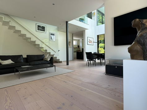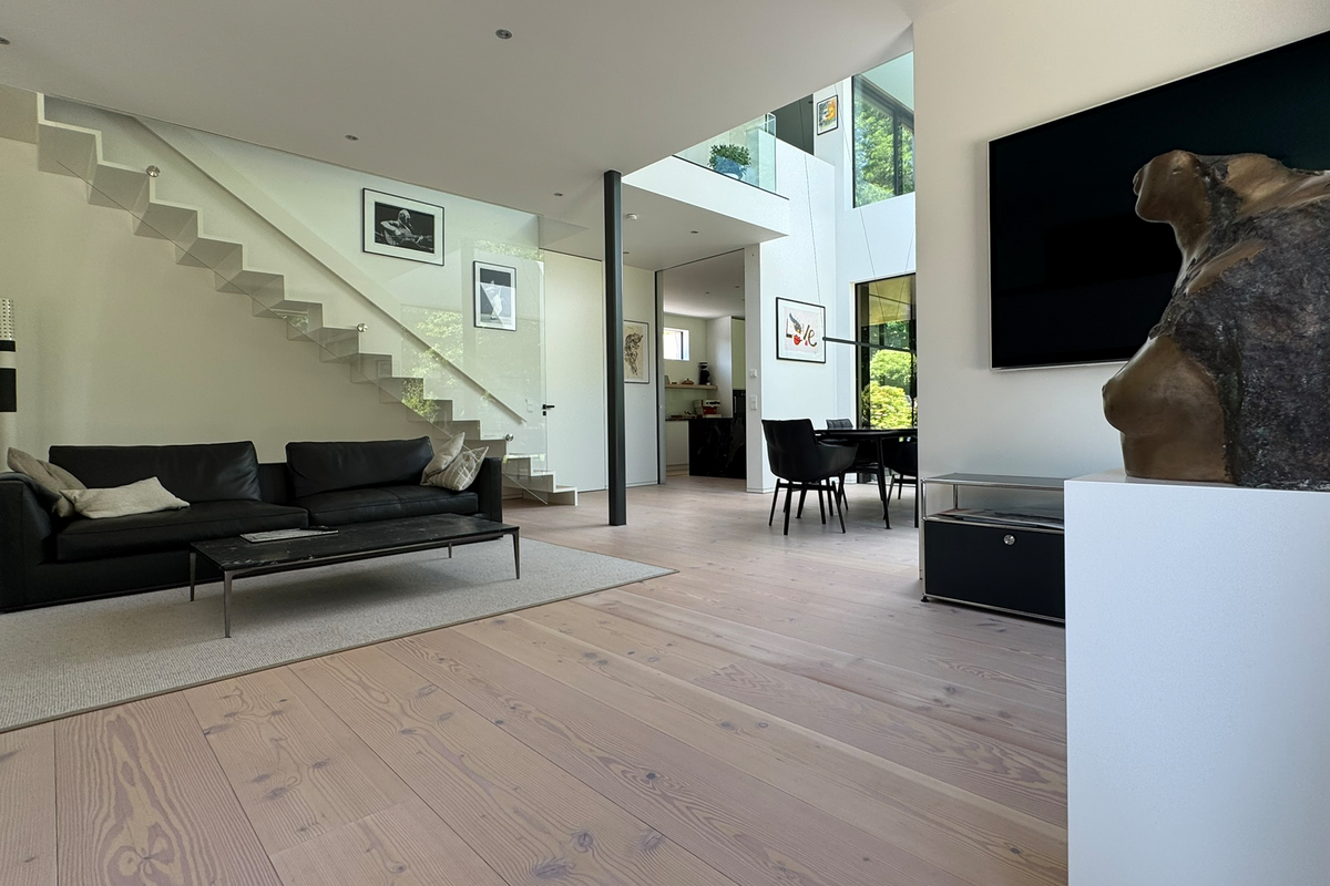 Im Inneren erwartet Sie eine raffinierte Raumaufteilung mit raumhohen Zimmertüren in der edlen Blackline-Ausführung. Diese flächenbündigen Türen sind nicht nur stabil und besonders strapazierfähig, sondern setzen auch stilistische Akzente im gesamten Wohnbereich. Die flächenbündig integrierten Koschmieder-Sockelleisten sorgen für eine nahtlose Verbindung zwischen Wand und Boden, wodurch der Raum optisch vergrößert wird und ein elegantes Gesamtbild entsteht.