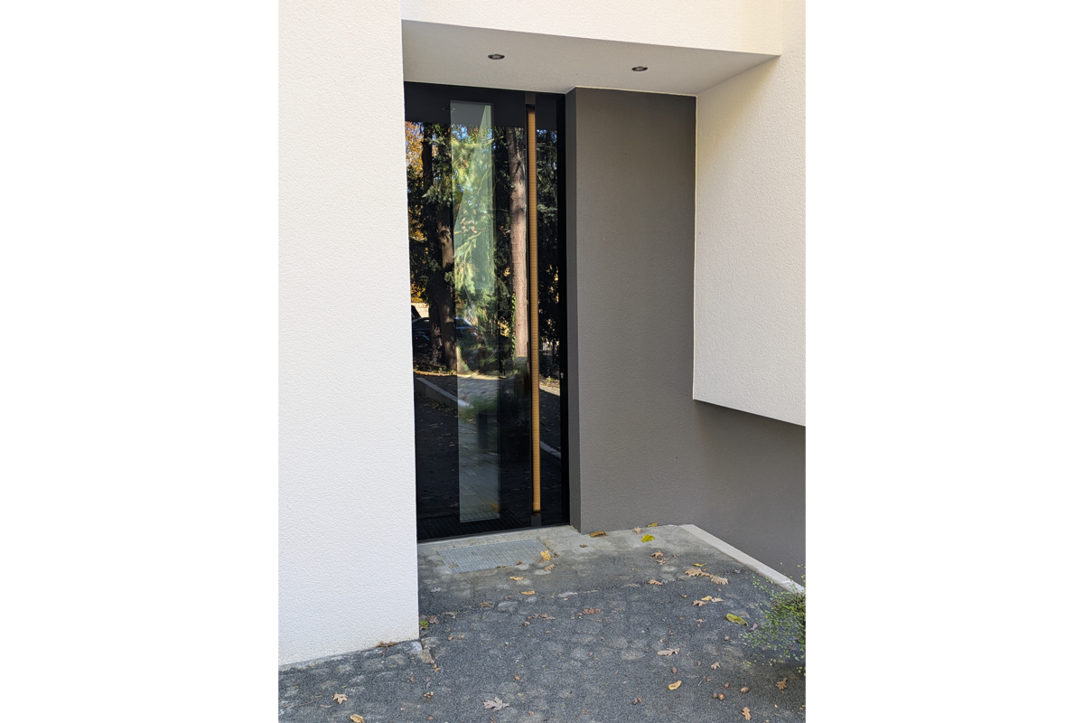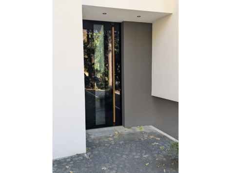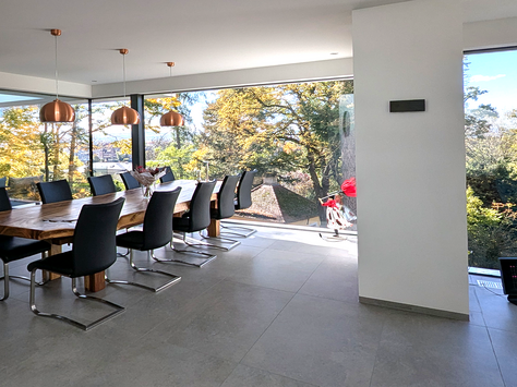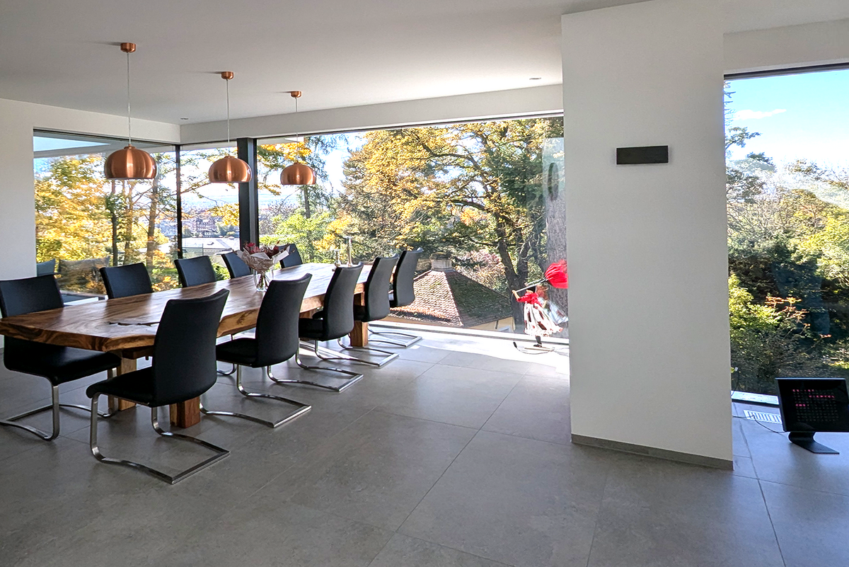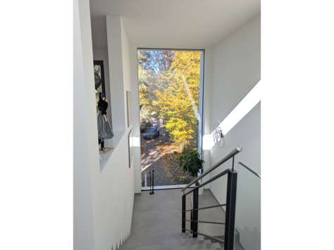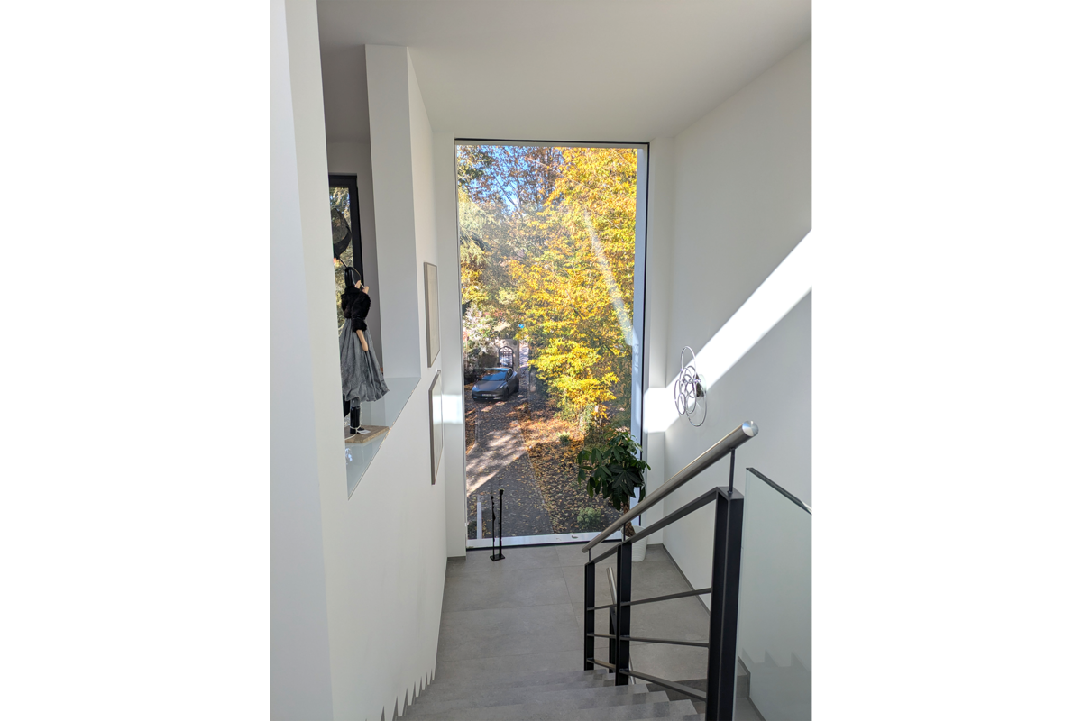 Großzügige, rahmenlose Glasfronten maximieren den Lichteinfall in allen Bereichen des Hauses. Eine beeindruckende große Scheibe und die senkrecht verbaute Glasecke durchfluten das Treppenhaus mit Licht. Das Tageslicht begleitet Sie den ganzen Tag.