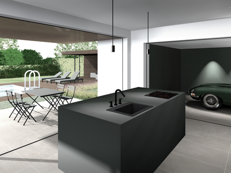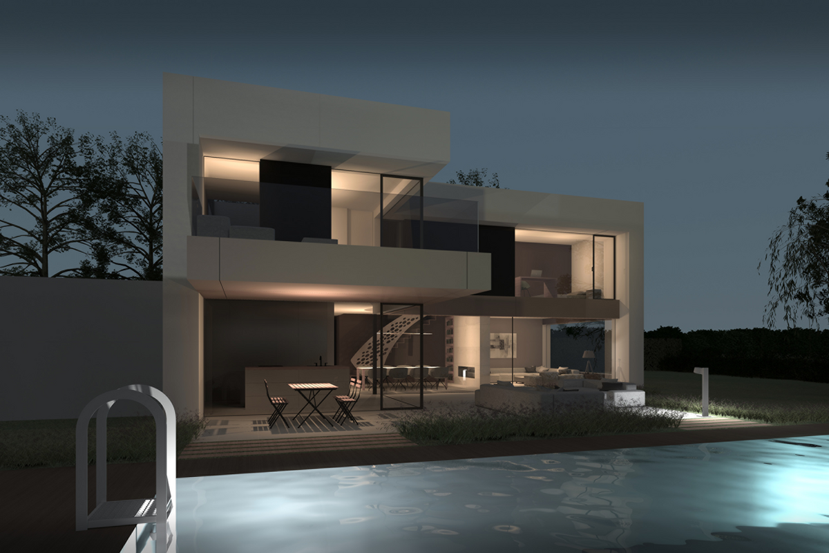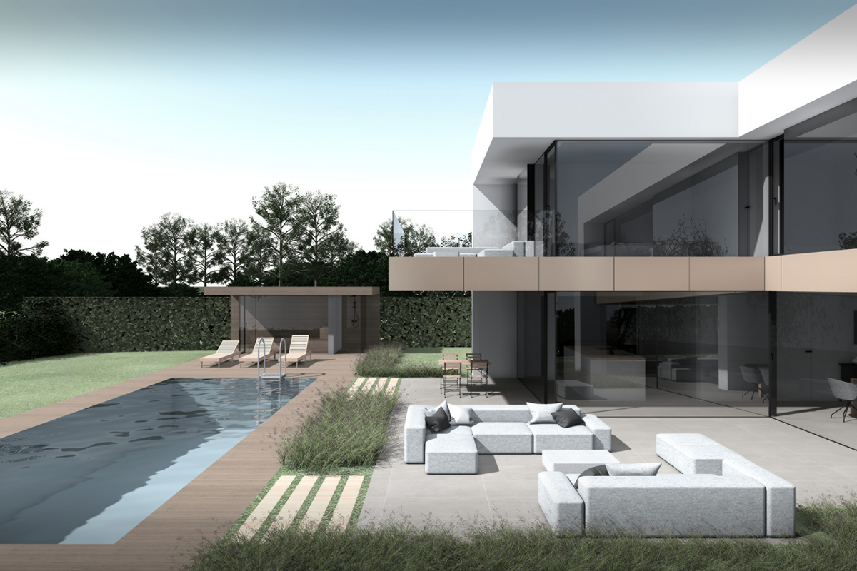 Zudem ist das Haus durch großzügige, raumhohe Glasfronten geprägt. Der Übergang vom Wohnbereich zur Terrasse und zum Pool ist fließend gestaltet, weshalb der Garten zum erweiterten Wohnzimmer wird – und zwar zu jeder Jahreszeit. Die klare Linienführung sowie die markante Auskragung des Obergeschosses bieten nicht nur Schutz für die Terrasse. Zusätzlich verleihen diese Details dem Gebäude eine skulpturale Präsenz in der gesamten Nachbarschaft.
